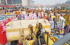 3月17日,在山東201省道威海市機場路上,該市交警五大隊民警在濃霧中設置警示標識。