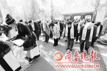 3日,尼山孔廟大成橋前,佩戴著黃色綬巾的來賓肅立,當日,曲阜市舉行壬辰年春季祭孔大典。欞星門內,緩步走出一組穿著明代服飾的禮生,有的手執至圣廟燈籠,有的手托托盤,列隊站立在來賓隊伍前面。