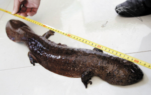 這條“娃娃魚”體長達62厘米 通訊員 賈鵬 劉玉花 記者 陳偉斌 攝 “純野生娃娃魚要求的周圍環境比較嚴格,北方基本沒有,這次在碧霞湖水庫發現‘娃娃魚’應該屬于山東省首例。