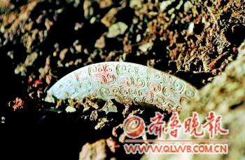 18日,沂水天上王城崮頂春秋大墓考古正在進行中,考古人員清理了棺槨部分。下午4時許,一段環狀的玉器露出土面,呈現出類似油脂的光澤,細看表面有清晰的雙鉤線紋飾。專家稱,應為玉環或者玉璧。據介紹,春秋時期,奉行周禮的各國對于玉器的使用十分嚴格。玉器是象征墓主人生前等級身份的物件。 本報記者 張中 攝