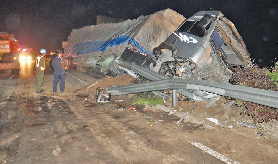 事故現(xiàn)場(chǎng),一輛大貨側(cè)翻在路中央的護(hù)欄上。