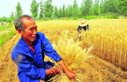 ■5月27日,山東蒼山縣尚巖鎮婁莊村農民王善啟在收割小麥。 自當日起,山東5490萬畝冬小麥自南向北開始收割,預計山東麥收將持續15天左右。據山東省農業廳近期進行的農情調度顯示,山東今年有望實現夏糧連續增產。 新華社照片