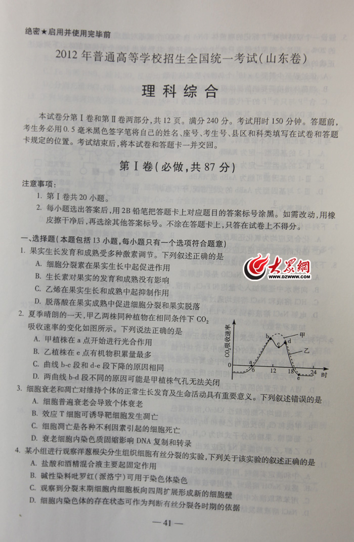 2012年山東高考理科綜合試題及參考答案