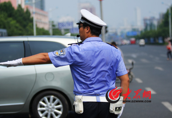 高溫“桑拿天”中執勤的市中區交警。(尹海洋 攝)