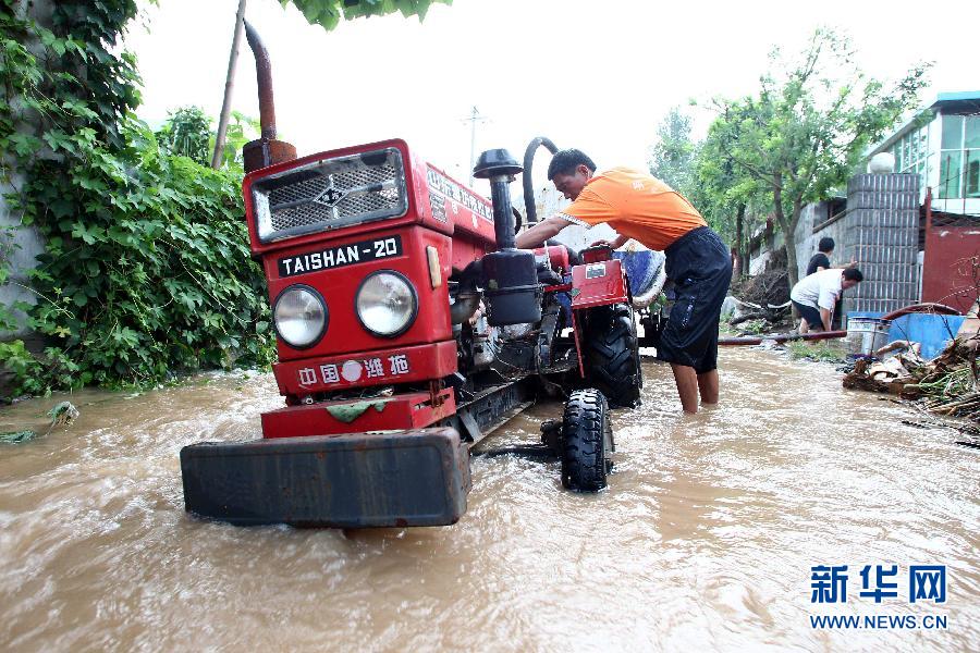 8月3日,山東青州王墳鎮王墳村的村民們在使用拖拉機排水自救。