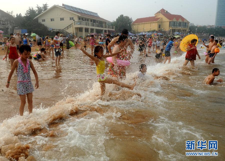 8月6日,游客在青島第三海水浴場戲水納涼。立秋前夕,青島沿海一線氣溫并不是很高,但因為空氣濕度大,午后時分依然悶熱,不少市民和游客選擇泡在海水中,感受絲絲清涼。 新華社記者李紫恒 攝