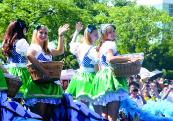 19支巡游方隊魚貫而入,歡快的啤酒舞、動感的夏威夷草裙舞、悠久的蘇格蘭樂隊表演以及啤酒節傳統的軍鼓樂等,依次激情上演(上圖),傳達著青島啤酒節的開放性以及“青島與世界干杯”的永恒主題。