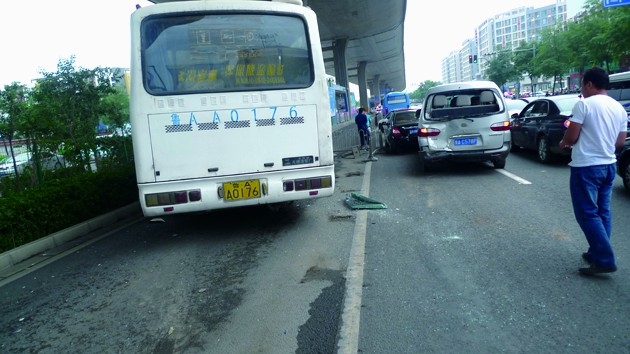 昨日早8:30左右,記者來到黃崗路和無影山中路路口,看到一輛大客車停在無影山中路路中央綠化帶中,有三節(jié)BRT護(hù)欄出現(xiàn)了缺口,被撞壞的護(hù)欄還在客車車輪下。客車上沒有乘客,車右側(cè)保險(xiǎn)杠受損嚴(yán)重,前擋風(fēng)玻璃出現(xiàn)破損。被客車撞上的第一輛商務(wù)車,后部已經(jīng)變形,后車玻璃也被撞碎,第二輛黑色轎車尾部也出現(xiàn)了變形,另外一輛紅色轎車受損較輕。