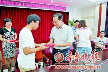25日上午,威海市暨環翠區2012年度特困高考新生救助金發放儀式舉行,來自環翠區的40名受助學生代表,分別領取了3000元至4000元不等的助學金。據悉,今年的特困高考新生救助活動中,威海市共發放助學金335.5萬元,惠及特困高考新生906名。 圖為威海市有關領導為受助困難學子發放獎學金。 本報記者 許君麗 本報通訊員 林偉強 攝影報道