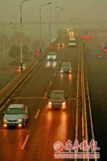 15日上午9點(diǎn),濟(jì)南經(jīng)十路暗如黃昏。 本報(bào)記者 周青先 攝