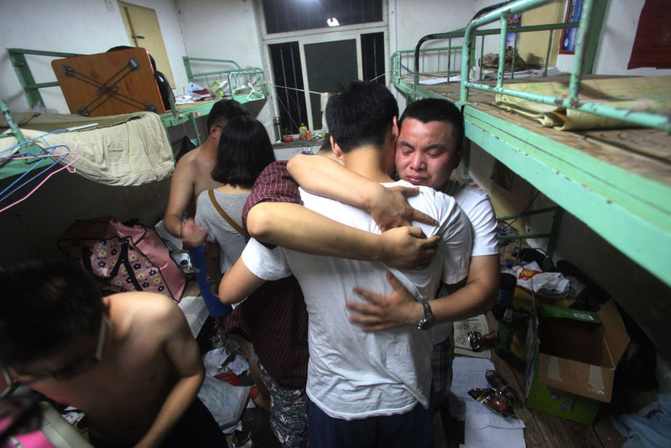2013年6月24日,山東濟南,在山東師范大學宿舍樓里,舍友們緊緊抱在一起不舍離去。因為這是他們大學生生涯的最后一夜。當晚,大學生們無法入眠,酒杯聲、哭聲交織在整個宿舍樓。第二天起床就要背著行囊啟程了,此時此刻發(fā)現校園生活是多么珍貴,四年大學時光轉瞬即逝,不得不各奔東西,像蒲公英一樣飄向社會每個角落,尋求屬于自己的新舞臺。