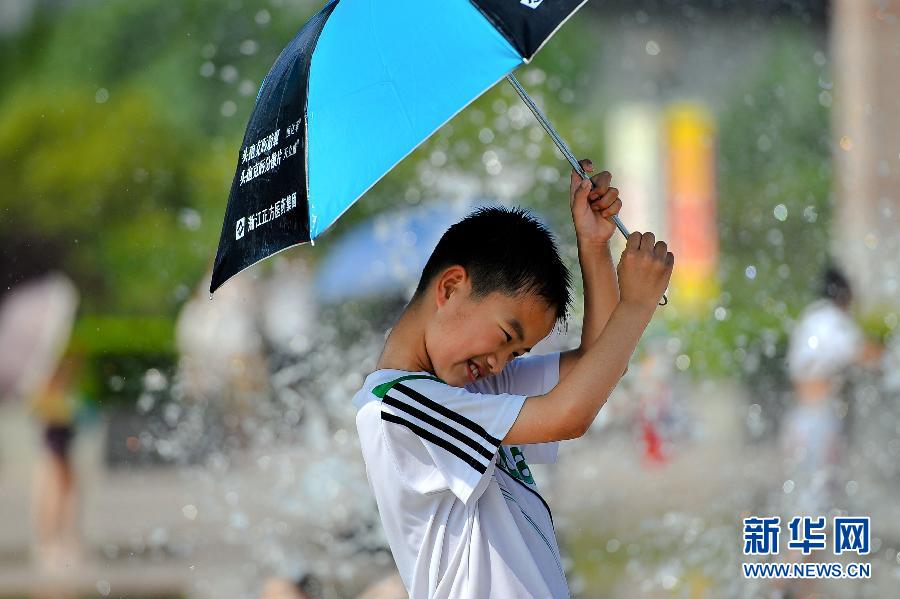 7月3日,在濟南市泉城廣場,一名小朋友在音樂噴泉旁戲水納涼。當日,泉城濟南最高氣溫達到38℃,難耐酷暑的市民紛紛來到護城河岸和泉水池畔,戲水納涼。 新華社記者 郭緒雷 攝