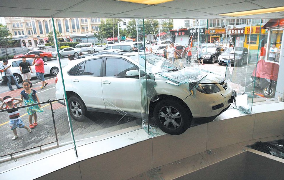 附近停車場(chǎng)的一位保安告訴記者,9點(diǎn)15分左右,他正在收費(fèi)亭里看報(bào)紙,忽然聽到“轟”的一聲,抬頭看見一輛越野車撞碎了玻璃沖進(jìn)餐廳!斑@輛車從包頭路拐過來后要停在快餐店外的停車位上,誤將油門當(dāng)成了剎車,車猛然朝著餐廳沖過去,當(dāng)時(shí)是名女司機(jī)開的車,車?yán)镞坐著一名女子!北0舱f。
