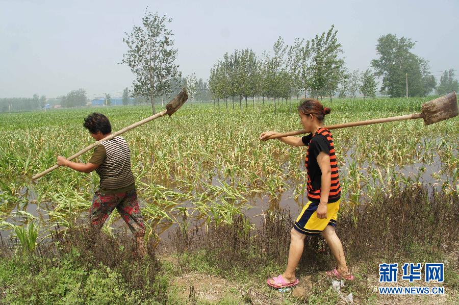 7月24日,在山東省聊城市經濟技術開發區蔣官屯,兩名婦女經過遭強降雨后的農田。近日,山東全省連續遭遇強降雨襲擊。據山東省人民政府防汛抗旱指揮部辦公室24日最新統計,該省農作物受災面積已達614萬畝。新華社發(張憲舉 攝)