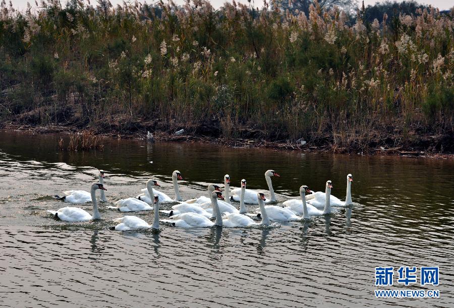 2013年10月20日 山東黃河三角洲保護(hù)區(qū)護(hù)鳥見成效 10月19日,一群天鵝在山東東營黃河三角洲自然保護(hù)區(qū)游弋。近年來,位于山東省東營市東北部的黃河入海口三角洲自然保護(hù)區(qū)采取濕地補(bǔ)水修復(fù)、生態(tài)林場建設(shè)、鳥類科普救護(hù)中心建設(shè)、鳥群生態(tài)監(jiān)控等措施,使得保護(hù)區(qū)內(nèi)的鳥群種類和數(shù)量逐年增加。目前,保護(hù)區(qū)內(nèi)共有鳥類300多種,每年春、秋候鳥遷徙季節(jié),數(shù)百萬只鳥類在這里捕食、棲息,這里已經(jīng)成為東北亞內(nèi)陸和環(huán)西太平洋鳥類遷徙重要的中轉(zhuǎn)站、越冬棲息地和繁殖地。新華社發(fā)(董乃德 攝)