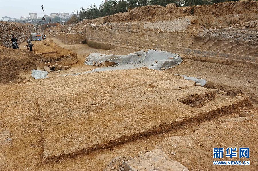 近日,施工人員在山東省青州市衡王橋西的沿河公園施工時發現一些古代城墻城磚,經山東省文物考古研究所和青州市文物局專家確認,此處為明代城墻遺址,對研究當地古建筑及古城歷史具有重要價值。經過一個月的考古挖掘,目前已經出土180米長的明代城墻。考古人員還發現,此明代城墻下疊壓了宋代城門。新華社發(王繼林 攝)