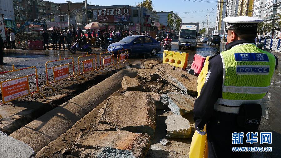11月7日,交警在處置濟南市黃臺南路地下供熱管道爆炸現場。當日上午,濟南市黃臺南路的地下供熱管道發生爆炸,導致路面被掀翻十幾米,數人受傷。 新華社發