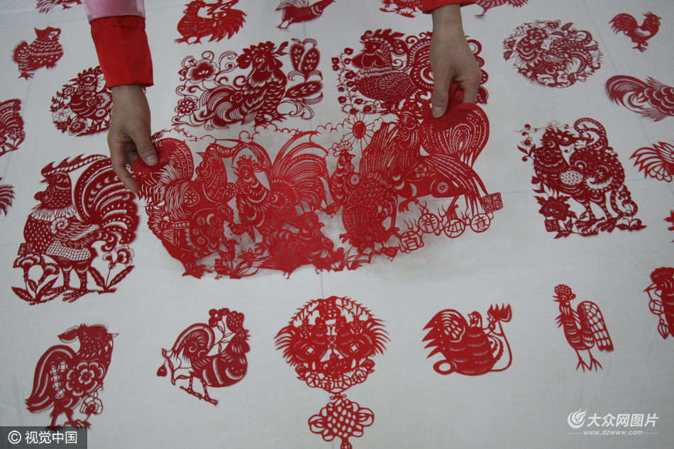 2016年 12月28日,山東省煙臺市,剪紙藝人胡文在工作室整理栩栩如生的剪紙雞,洋溢著節日的喜慶氣氛。圖片作者:鳳尾竹/視覺中國
