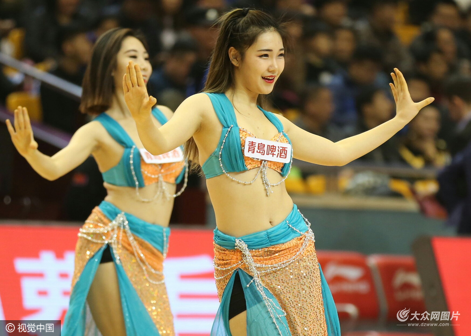 2017年1月11日,山東省濟(jì)南市,山東濟(jì)南省體育中心舉行山東高速vs浙江稠州銀行比賽。性感籃球?qū)氊悷嵛柚䴙橘悎鲞\(yùn)動員加油助威,場下休息時籃球?qū)氊悢[弄手機(jī)自嗨賣萌拍照。圖片作者:杰恩/視覺中國