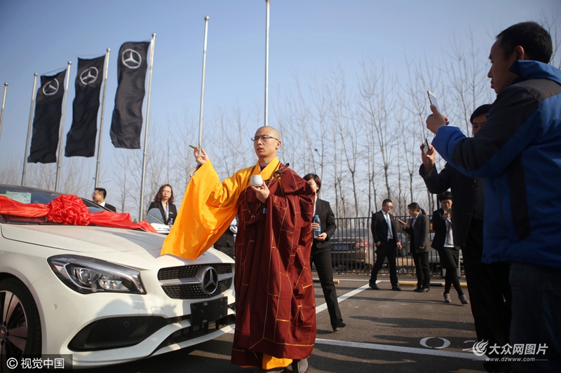 2017年1月15日,山東省濱州市,一家知名豪車品牌4S店請高僧為車主預訂的十多臺新車舉行了盛大的開光祈福儀式,場面十分壯觀,車主紛紛用手機拍攝視頻記錄下這一隆重的場面。