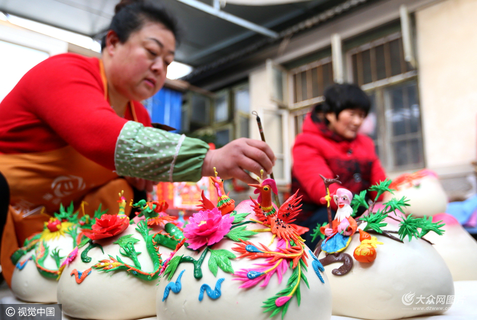 2017年01月19日,山東省青島市,春節(jié)臨近,山東即墨市沿海一帶的農(nóng)民忙著趕制花饃,迎接即將到來的新春佳節(jié)。農(nóng)民們將沿海漁家文化和地方民俗特色的面塑做到花饃上,惟妙惟肖,栩栩如生。春節(jié)時分,家家戶戶吃花饃祝福新年吉祥。