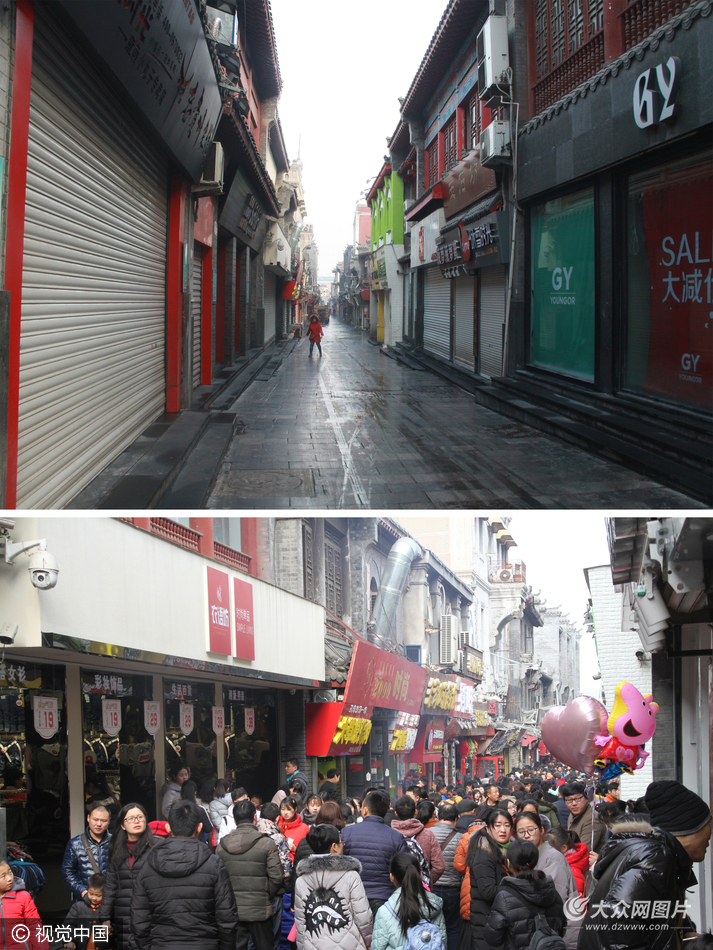 2017年2月3日,濟南,攝影師用鏡頭記錄了年三十前濟南芙蓉街、泉城路、泉城廣場、等繁華鬧市區(qū)人煙稀少的“空城”景象,春節(jié)后人們紛紛返回濟南后,再次同一景別記錄,原本難得的寂靜變得喧囂與熱鬧,車流人流開始增多,形成鮮明的反差。