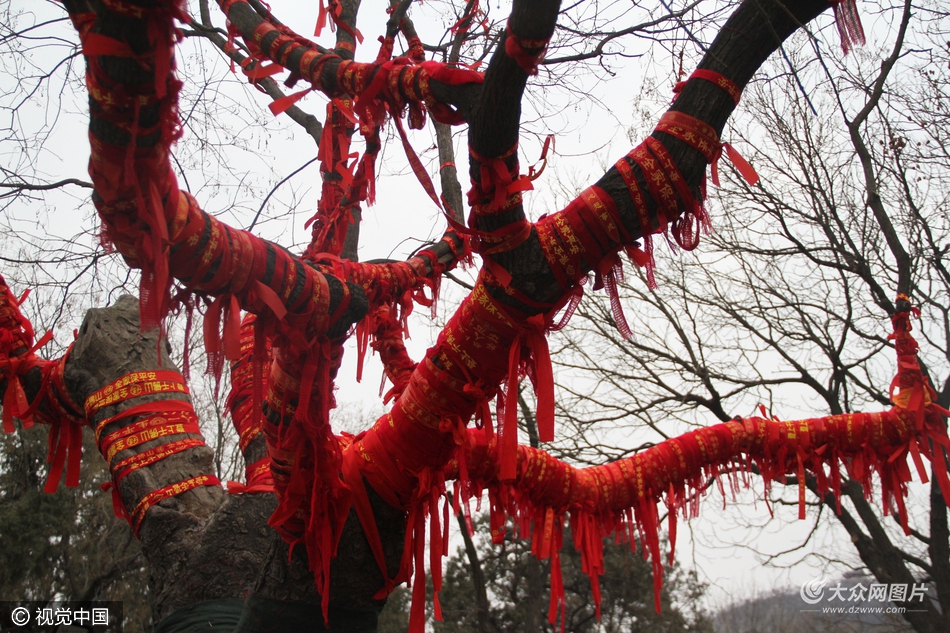 2017年2月7日,濟南,在千佛山景區,一棵古樹被游人的祈福帶纏滿“全身”,樹木纏繞成密密麻麻的紅色“許愿帶”。