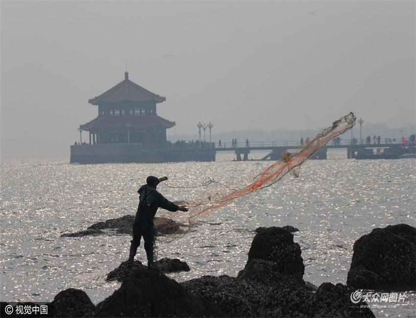 2017年2月28日,青島,市民在棧橋海域捕魚(yú)。