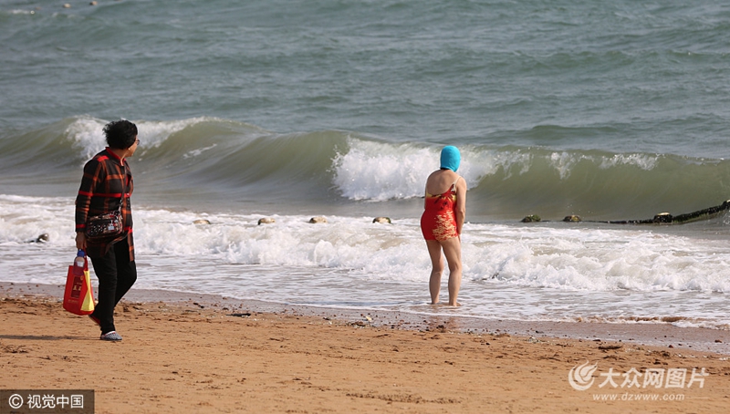 迎風搏浪霸氣足!乍暖還寒青島大媽戴“臉基尼”下海暢游 (/5)