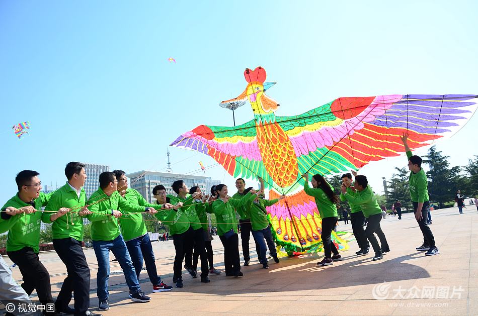 2017年4月22日,山東濰坊市人民廣場上舉行風箏放飛活動,一只60余米長的巨龍風箏和鳳凰風箏格外惹注目,20余名市民齊心協力將其放飛。