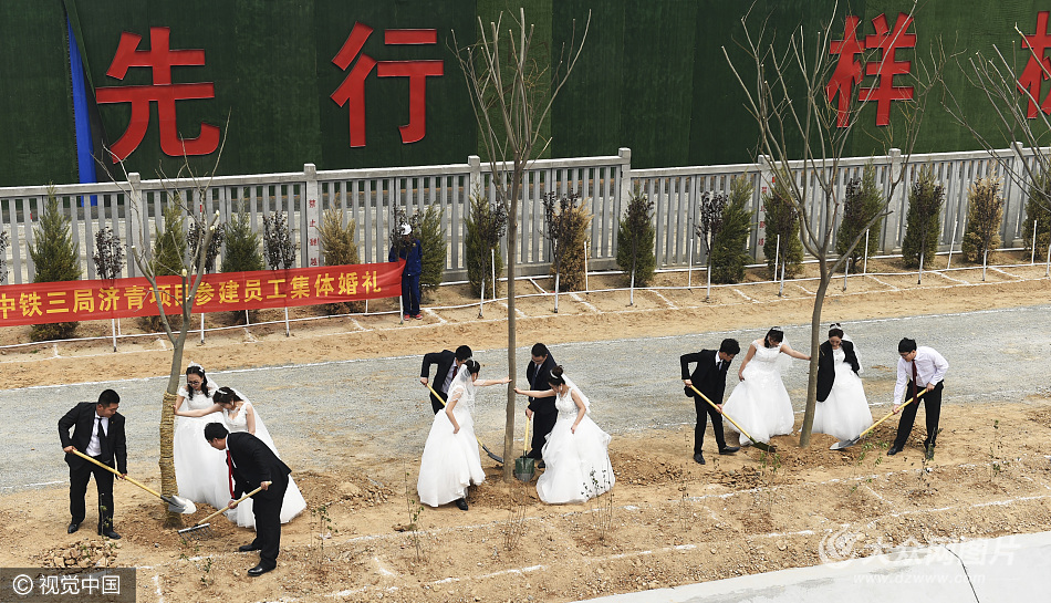 2017年4月24日,山東鄒平,五一勞動節前夕,正在建設中的濟青高鐵中鐵三局項目部鄒平縣建設工地的16對新人穿上婚紗、工裝在自己的施工現場拍攝結婚照,并栽下象征永久幸福的合歡樹,作為美好的青春記憶,拍攝的照片將在各建設工地進行展示,以激發建設工人的干勁和熱情。