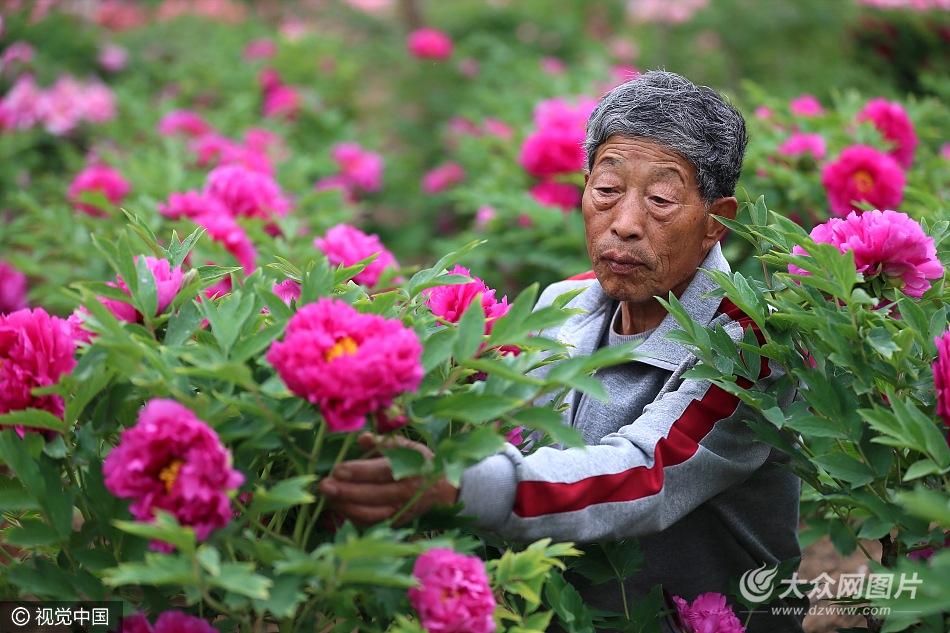 2017年4月26日,青島,位于即墨市省級高新區柳溝五村牡丹園的萬株牡丹近日進入盛花期,這個牡丹園是該村78歲農民解維竹花了十多年時間培育出來的,品種有100多個,吸引了眾多游客入園觀光賞花。