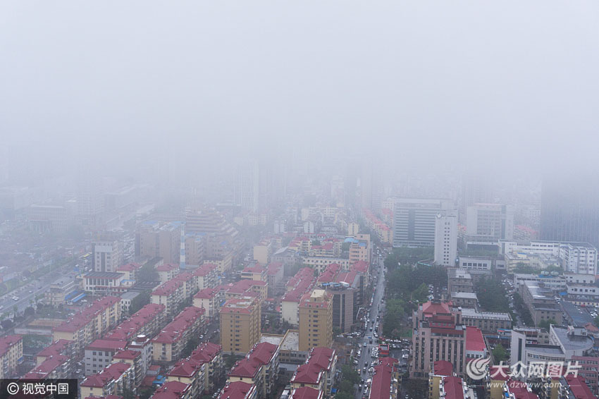 5月9日,煙臺芝罘區大霧彌漫,城市樓宇、海上船只若隱若現。煙臺迎來立夏后第一場降雨,加上降溫形成大霧。