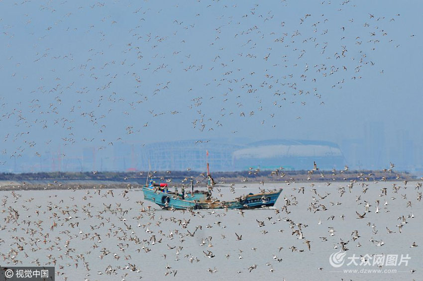5月9日,青島市膠州灣漲潮期間,數萬只候鳥從四面八方涌入環灣灘涂,形成壯觀的進食場面。