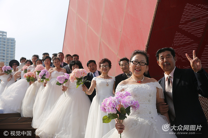5月20日,在青島海岸青年廣場上演了一場子女專為父母補辦的集體海邊婚禮,忙碌半生的老人們身著潔白的婚紗,與愛人一起攜手“重返20歲”。