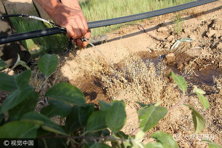 5月18日,在榮成市海波生態(tài)農場,工人正在用滴灌給果樹澆水。