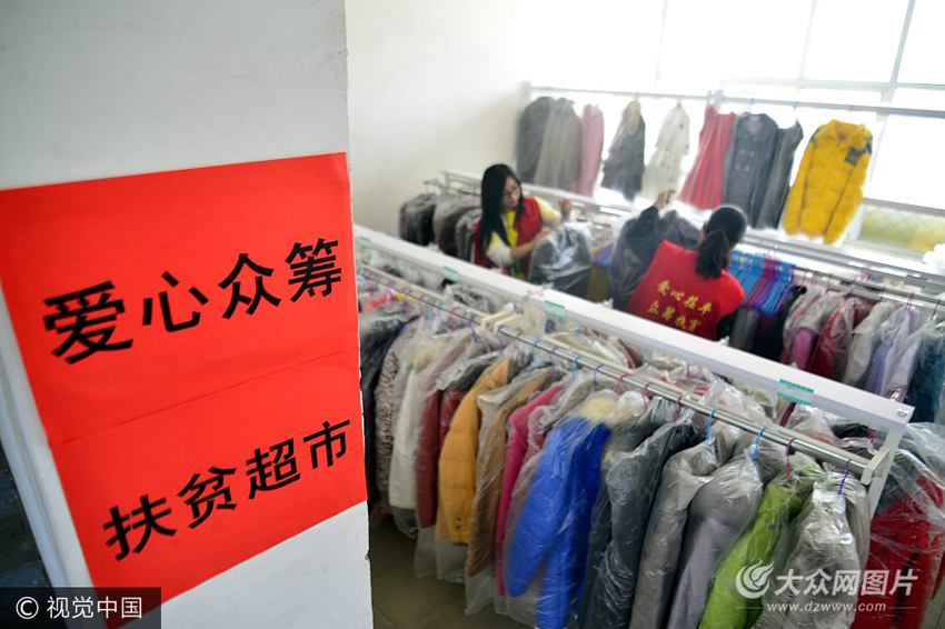 5月23日,在聊城市茌平縣愛心茌平眾籌扶貧運營中心的扶貧超市,工作人員在整理愛心單、人士捐贈的衣服。