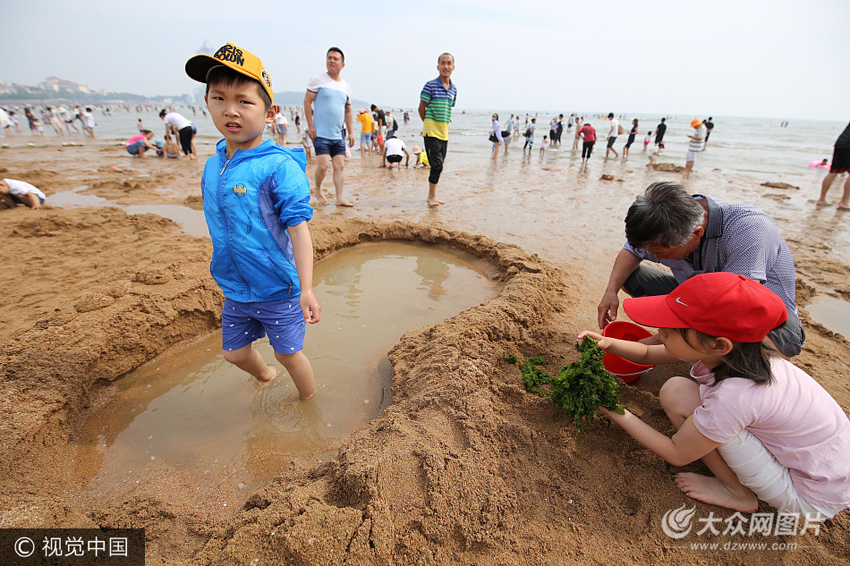 5月29日,游人在青島第一海水浴場休閑度假。端午小長假期間,海濱城市青島旅游爆棚,各大海水浴場再現酷暑時節人山人海下餃子的盛況,游人洗海澡戲水玩沙趕海撈海鮮各得其樂,盡情享受歡樂假日。