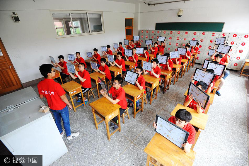 6月4日,青島平度一中的工作人員將所有的考場的時鐘全部校準。