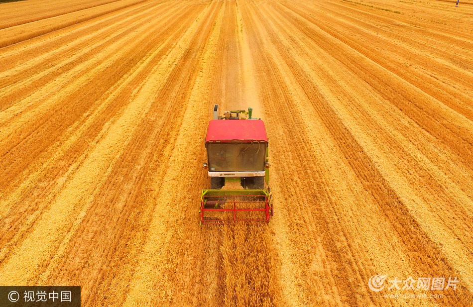 2017年6月5日,濟南市區陰云密布。黃河濟南段北岸一望無際的千頃麥田已經成熟,當地村民紛紛趕來請收割機搶收小麥,趕在下雨之前收獲。