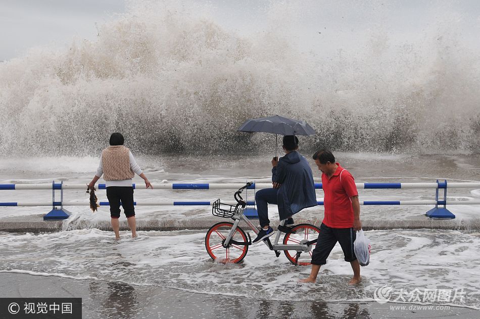 2017年6月6日,受中雨和大潮影響,青島市澳門路被淹,游客騎單車冒險(xiǎn)觀潮看海。