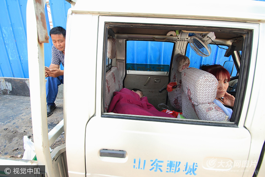 6月7日,全國高考第一天,菏澤市牡丹區(qū)實驗小學(xué)考點外,一名來自縣區(qū)的考生由于家距離考場較遠(yuǎn),單程需要一個多小時,午飯后在自家農(nóng)用車內(nèi)午休,一個小風(fēng)扇是降溫的工具,母親抱著年幼的弟弟在前排休息,父親坐在車后的車斗看手機(jī)。