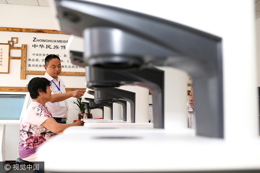 6月22日,即墨市藍(lán)村鎮(zhèn)王演莊社區(qū)的工作人員王文祥(右)指導(dǎo)村民使用“智能蓋章機(jī)”。