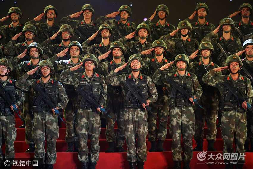 6月28日,濱州,在慶祝建黨96周年“激情放歌頌黨恩”千名黨員演唱會上,武警戰士荷槍表演大合唱《當那一天來臨》。