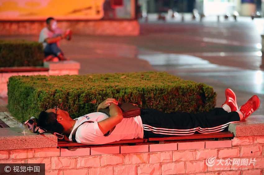 7月10日,濰坊市,“露宿者”在濰坊火車站廣場席地而眠。