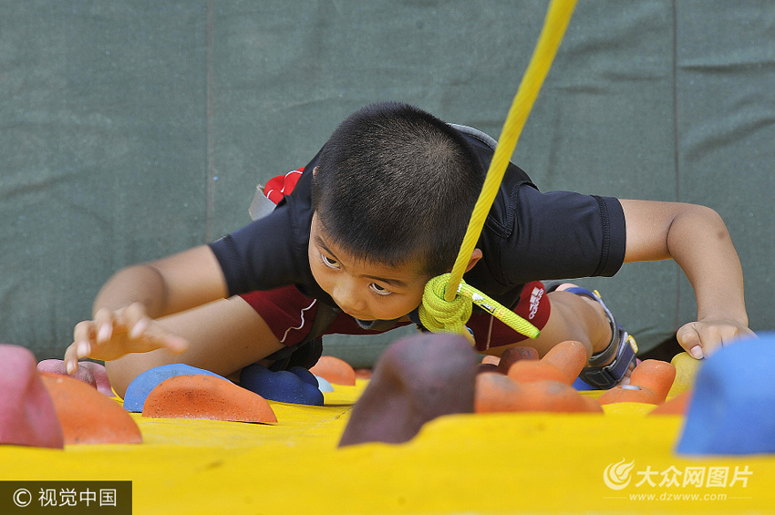 7月22日,一名小朋友在煙臺藍灣游樂場練習攀巖。