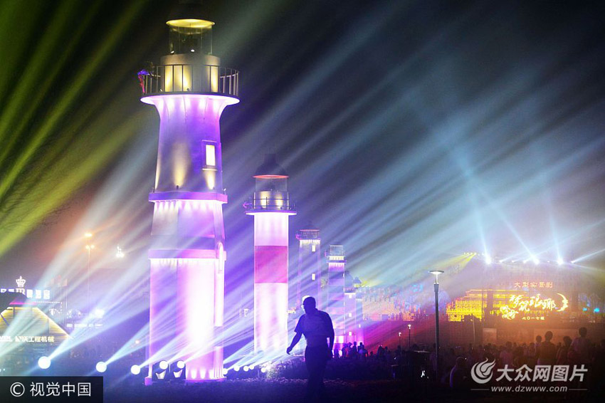 8月6日,青島金沙灘啤酒城拍攝的燈塔燈光秀。