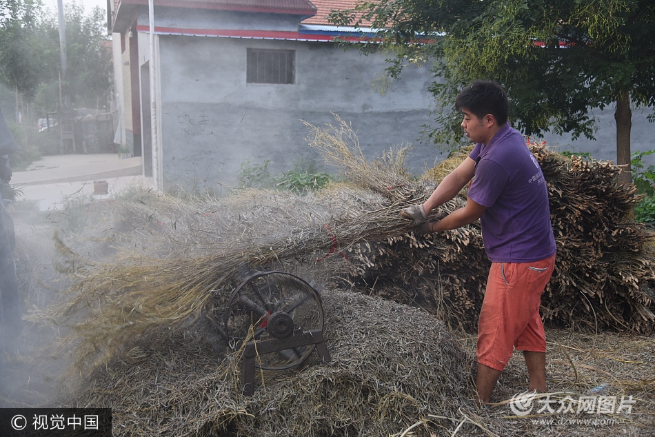 2017年8月16日,山東濱州,小伙在自家的廠房前加工掃把。