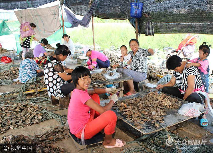 暑期以來,在榮成市不少漁港碼頭的養(yǎng)殖串苗棚里,活躍著一群跟母親出來打工的中小學(xué)生。他們多是外來務(wù)工人員的子女,趁著暑假跟母親出來打工賺學(xué)費(fèi)或補(bǔ)貼家用。他們每天從早晨四五點(diǎn)鐘到傍晚五六點(diǎn)鐘,除了中午吃飯時(shí)間算是休息時(shí)間外,雙手幾乎不停將一只只長(zhǎng)著牡蠣苗或海虹苗的扇貝殼串在養(yǎng)殖繩上。一天十多個(gè)小時(shí)的坐著彎腰忙碌,讓他們?cè)趲椭赣H多賺取幾十元收入的同時(shí),也體驗(yàn)到勞動(dòng)的艱辛與父母的不易。