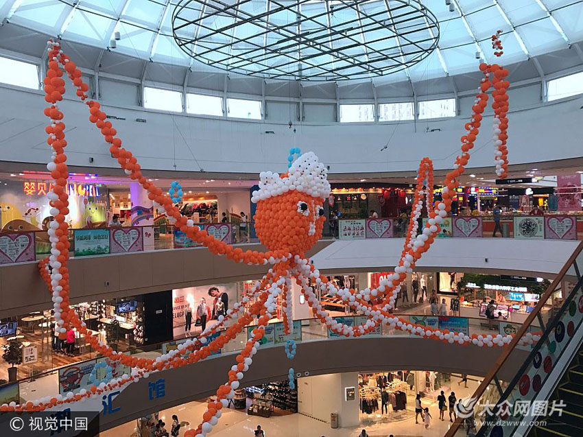8月20日,濱州市,一商場內(nèi)“空降”巨型章魚引眾多市民圍觀合影。據(jù)了解,該“章魚”由近萬只氣球組成,體型龐大,造型逼真。